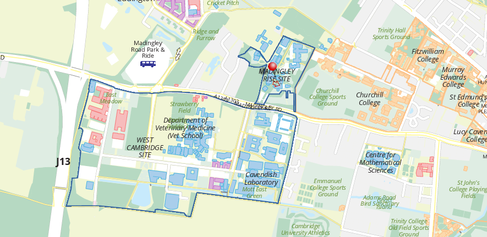 The Battcock Centre is south of the Madingley Road (A1303) – you need to turn off left straight after the traffic lights towards Madingley Rise. If you are westbound on Madingley Road (heading away from the city centre), the right turn is signed Madingley Rise site, Institute of Astronomy, Battcock Centre for Experimental Astro Physics. If eastbound towards the city, look for a long traffic island with a left-turn break through signposted Madingley Rise. The Battcock Centre car park can be accessed on the left and the building is just 150 metres away a head.