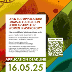 Planetary Science and Life in the Universe MPhil programme is excited to announce fully paid scholarships available to Home-fee status female students through a collaboration between the Parasol Foundation and Murray Edwards College.These awards will provide opportunities to enable more women to pursue higher education at the Institute of Astronomy…